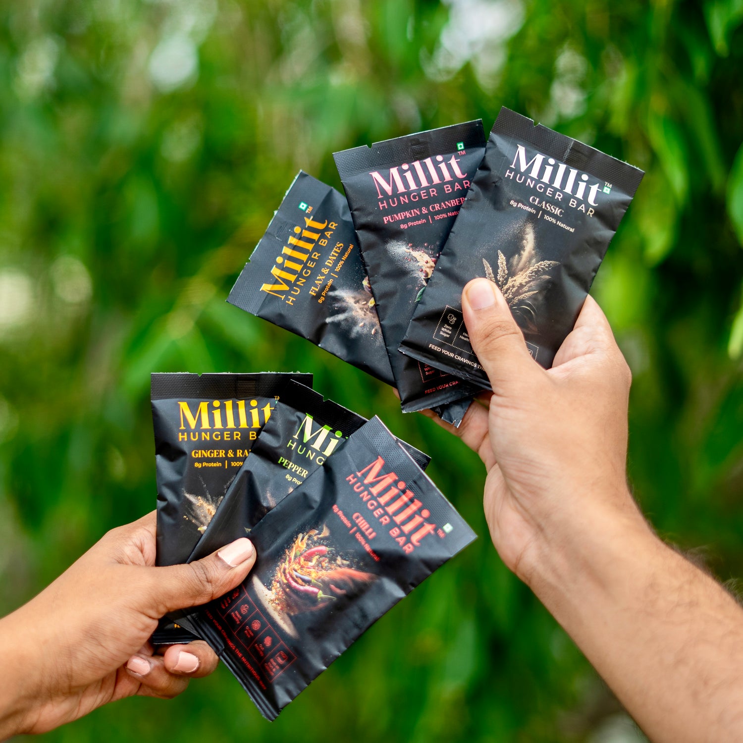 The Millit Hunger Bar has got you. It has 8g of protein with essential micro and macronutrients. Get all the nutrition without the calories.